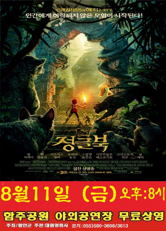 |  | | | ⓒ (주)영남도민일보 | | [영남도민일보] 김진규 기자 = 함안군은 군민의 복지증진과 문화향유 기회를 확대하기 위해 오는 11일 오후 8시, 함주공원 야외공연장에서 8월의 무료 영화 ‘정글북’을 상영한다.