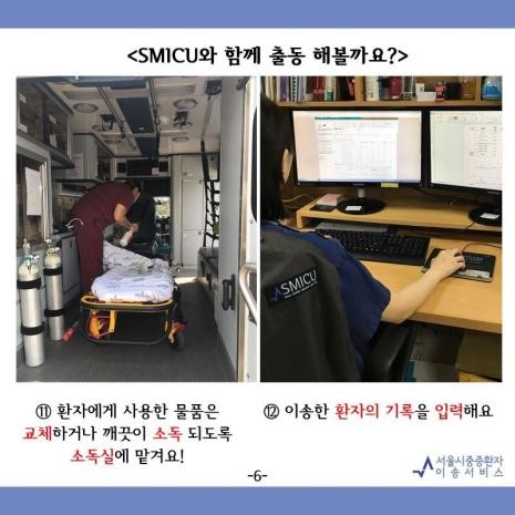 ‘서울형 중증환자 이송서비스(Seoul Mobile Intensive Care Unit, S-MICU)’는 심근경색, 뇌졸중 등 중증환자를 병원에서 다른 병원으로 이송할 때 환자가 안정적인 상태를 유지할 수 있도록 이송 중에도 전문적인 관찰‧치료를 제공하는 공공이송서비스다. 서울대학교병원이 전문 장비를 갖춘 중증응급환자 치료용 대형 특수구급차 1대와 17명(전문의 6명, 간호사 3명, 응급구조사 8명)으로 구성된 응급이송팀을 24시간 운영, 이송 상황이 발생하면 4~5명이 함께 탑승해 환자 이송을 전문적으로 맡는다. 이동 중 응급상황에서도 의료인의 처치가 가능해 중증응급환자의 생존율을 높이는데 기여하고 있다. 전문의, 응급구조사, 간호사가 환자의 상태에 따라 이송 중에도 약물투여, 환자감시 등을 시행한다. 수용병원 도착 후엔 환자 이송과 동시에 의료진에게 요청 병원의 환자기록, 영상자료, 전원 소견서, 이송 중 기록지까지 전달, 이송을 완료한다.