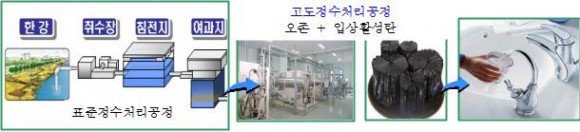 고도정수처리는 기존 표준정수처리 공정에 오존 소독과 입상활성탄(숯)으로 한 번 더 걸러주는 공정을 추가한 것으로 ① 오존의 강력한 산화작용을 이용하여 물속에 있는 유기물을 분해하고 ② 입상활성탄(숯)에 뚫려 있는 아주 미세한 구멍으로 오존 처리한 수돗물에 남아있는 미량의 맛․냄새 유발물질 까지도 흡착해 제거하는 방식이다. 이러한 고도정수처리 과정을 거치게 되면 조류(藻類)로 인해 발생하는 흙(Geosmin)·곰팡이냄새(2-MIB) 유발물질과 소독부산물 등 미량유기물질을 효과적으로 처리할 수 있다.