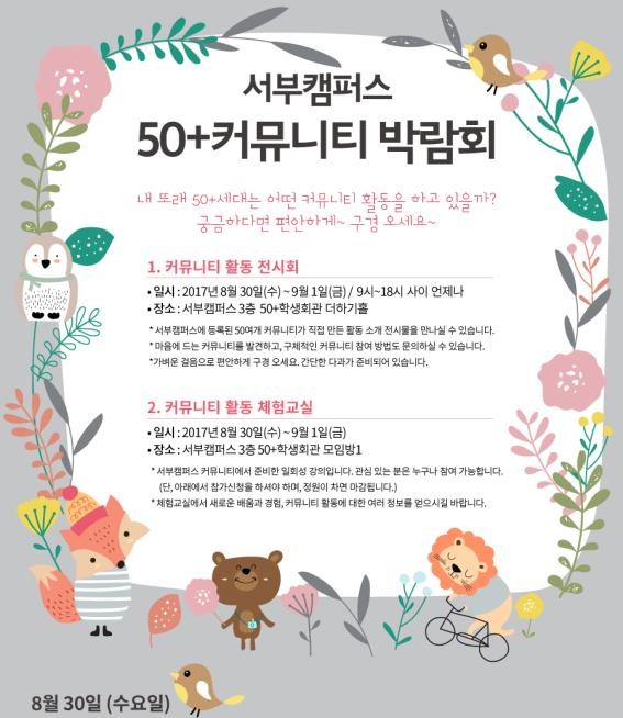 또, 8월 30일(수)부터 9월 1일(금)까지 서울시50플러스 서부캠퍼스 3층 더하기홀에서는 50+커뮤니티의 활동을 한 눈에 볼 수 있는 ‘50+커뮤니티 박람회’가 진행되며 시민 누구나 참여할 수 있는 다양한 무료 체험교실도 열린다.