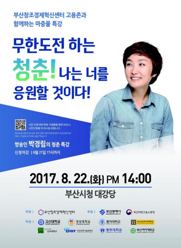 이번 특강은 대한민국 대표 20대 청춘 인생멘토인 방송인 박경림 강사가 ‘무한 도전하는 청춘! 나는 너를 응원할 것이다!’라는 주제로 강의를 펼친다.
