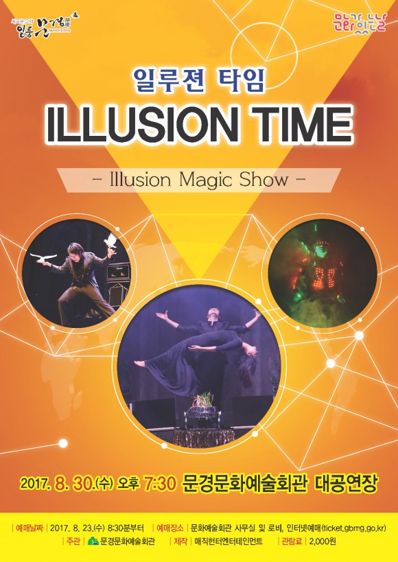 8월 문화가 있는 날에는 무더위에 지친 몸과 마음을 시원하게 달래줄 공연“일루젼 타임”공연이 문경문화예술회관 대공연장에서 오는 8월 30일(수) 저녁 7시 30분에 열린다.