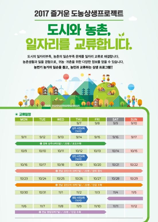 이번 상주시와의 도농일자리교류프로그램에서는 180여개 회원농가로 구성된 참배수출단지 농업회사법인의 소속농가에 방문하여 배 수확을 돕는 농가작업을 한다. 지역 전문가에게 듣는 상주시 귀농귀촌 정책, 귀농귀촌 선배와의 만남, 지역 탐방 등 다양한 교류 프로그램도 준비되어 있다.