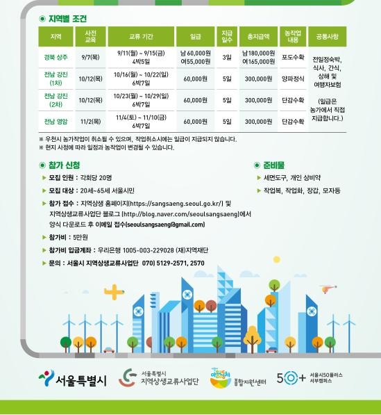 |  | | | ⓒ (주)영남도민일보 | | 특히, 도농일자리교류사업은 서울시 중간지원조직인 지역상생교류사업단에서 계획․운영하고 있는 프로그램으로, 서울시민의 귀농귀촌을 돕고 서울시와 우호교류협약을 맺은 지자체의 일손부족 현상을 상생의 방법으로 해결하기 위해 추진하고 있다. 상반기 도농일자리교류사업은 지난 5월~7월에 경북 상주, 경남 창녕, 전남 영암을 대상으로 추진한 바 있다. 총 45명의 서울시민이 참여하여 마늘․양파․담배잎 수확, 감나무 새순 제거, 무화과 나무 정리 등 다양한 농가작업에 참여하였다. 농촌일손돕기 참여를 원하는 시민은 앞으로 남은 전남 강진군․영암군 도농일자리교류 프로그램에 대해 사전 교육일 전까지 신청하면 된다.