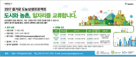 |  | | | ⓒ (주)영남도민일보 | | 20세에서 65세의 서울시민이면 누구나 신청할 수 있으며, 접수는 선착순으로 서울시 지역상생 홈페이지(http://sangsaeng.seoul.go.kr/)에서 신청서를 내려 받아 사전 교육일 전까지 이메일(seoulsangsaeng@gmail.com)로 신청하면 된다.