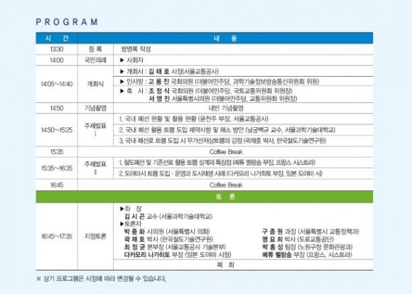 세미나에서는 서울교통공사가 국내 철도폐선의 현황에 대해서 설명하고 서울과학기술대학교에서 폐선을 활용해 트램을 도입할 때의 제약사항과 해소 방안을 발표한다. 이어 한국철도기술연구원에서는 신교통 시스템으로 주목받고 있는 무가선 저상 트램의 강점을 소개한다.