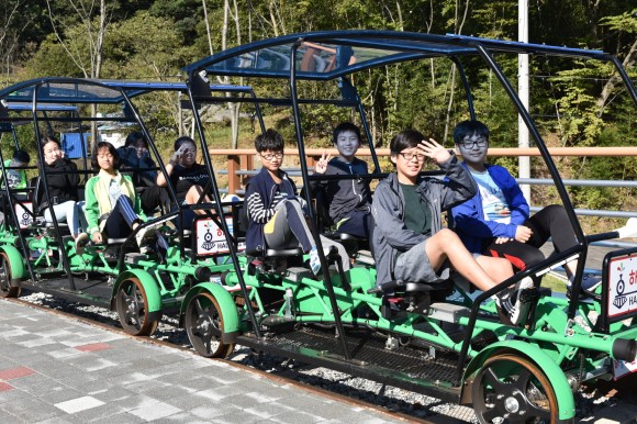 교직원과 학생들이 4인 1조를 이뤄 레일바이크를 타고 오면서 주변의 자연 경관을 감상하고 이명터널의 화려한 경관조명과 하동의 사계절 풍경 사진을 보며 감탄했다. 또한 북천역에 있는 작은 갤러리에서 하동을 대표하는 꽃양귀비 등을 그린 미술작품을 감상했다.