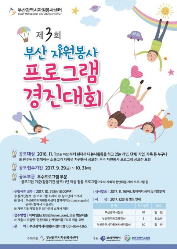 올해로 3회를 맞은 경진대회는 지역사회 문제해결과 공익을 위해 활동하고 있는 부산의 개인, 청소년, 가족, 단체, 기업 등 부산시민 누구나 참여할 수 있다. 부산의 아름답고 건강한 자원봉사문화를 정착시키고 확산하기 위한 취지이다.