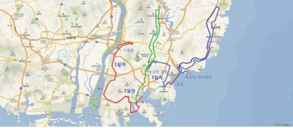 성화봉송 구간은 △1일차 구포역~덕포역~하단~대신동~영도대교~북항 △2일차 자갈치시장~서면역~범어사역~사직실내체육관~송상현광장 △3일차 송상현광장~수영역~용호선착장~요트경기장~기장IC~청강사거리~장산역~영화의전당~해운대해수욕장으로 이루어져 있다.