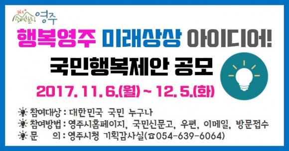 |  | | | ⓒ (주)영남도민일보 | | [영남도민일보] 김창기 기자 = 영주시는 힐링중심, 행복영주! 실현을 위해 시민들의 창의적이고 혁신적인 제안을 받아 시정에 반영하는 ‘행복영주 미래상상 아이디어’ 국민행복제안 특별공모전을 실시한다고 3일 밝혔다.