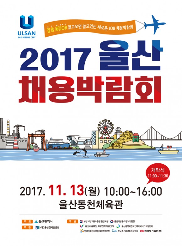 오는 11월 13일 오전 10시 동천체육관에서 ‘알쓸新JOB’(알고오면 쓸모있는 새로운 JOB 채용박람회)이라는 슬로건으로 진행되는「2017 울산채용박람회」에는 유망 중소기업 등 113개의 구인기업(직접 75, 간접 38)이 참가해 400여 명의 구직자를 채용할 계획이다.