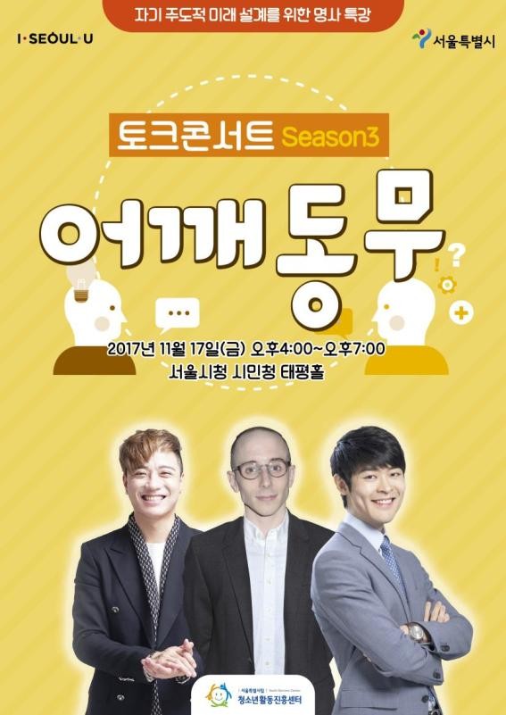서울시는 17일(금) 16시~19시 졸업과 사회진출을 앞두고 있는 전환기 청소년(중3‧고3) 200여 명을 대상으로 자기주도적 미래 설계를 위한 '명사특강! 토크콘서트 어깨동무'를 무료로 개최한다고 밝혔다. 올해로 3회째를 맞은 토크콘서트에는 공부의신 '강성태'와 뇌섹남 '타일러 라쉬'가 청소년들과의 토크와 강연을 진행한다.
