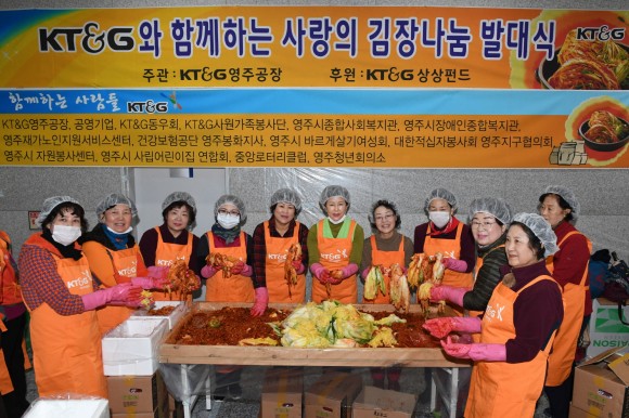 사랑의 김장 나눔 행사는 KT&G 복지재단의 후원으로 2004년부터 이어오는 행사다. 올해는 KT&G 영주공장 사원과 가족봉사단, 공영기업, 영주시자원봉사센터, 영주시사립어린이집연합회, 바르게살기 여성봉사회, 영주 JCI, 건강보험 영주봉화지사, 중앙로타리클럽, 적십자 영주지구협의회, 영주시종합사회복지관, 영주시장애인종합복지관, 영주재가노인지원센터 등에서 200여명이 참여해 축제 같은 분위로 김장을 마련하였다.