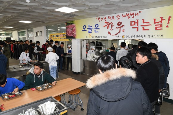 이번 행사는 자라나는 청소년에게 한우의 맛을 알리고 안전한 고급육이라는 이미지를 심어주기 위해 김재광 영주부시장과 한우협회 회원들이 학생들과 함께 점심식사를 가졌다.