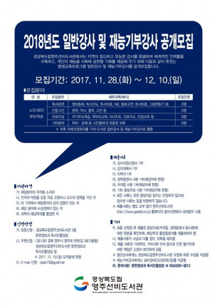 「2018년도 일반강사 및 재능기부강사」모집기간은 2017년 11월 28일(화)부터 12월 10일(일)까지이며, 제출서류는 별도 교부 없이 영주선비도서관 홈페이(http://www.gbelib.kr/yj) 공지사항에서 양식을 내려받아 사용하면 된다. 기타 자세한 내용은 홈페이지 및 3층 문헌정보과(☏054-630-3813)로 문의하면 된다.
