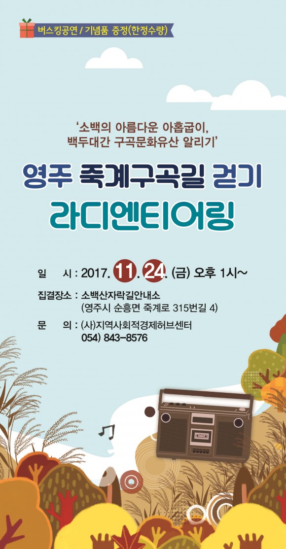 영주시가 주최하고 (사)지역사회적경제허브센터가 주관하는 이번 행사는 구곡에 대한 다양한 이야기를 라디오를 통해 들으며 걷고, 대금공연, 통기타 공연을 관람할 수 있다. 또 구곡에 대해 간단한 퀴즈를 풀며 출발지점으로 돌아오는 방식으로 진행된다.