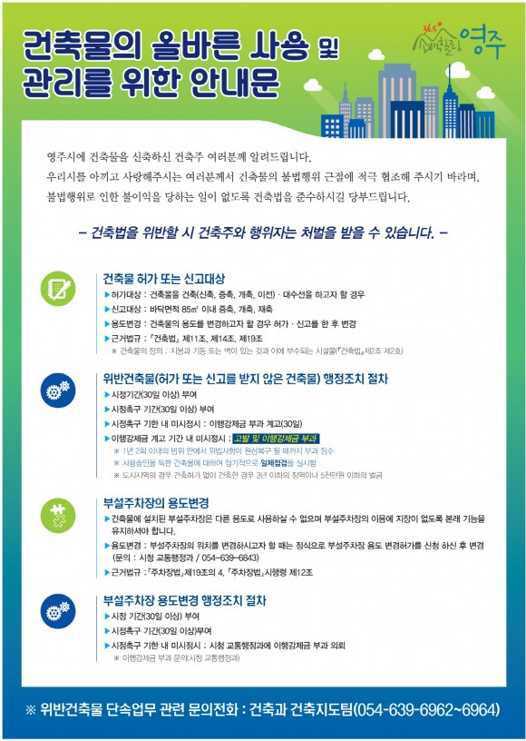 영주시 김동택 건축과장은 “관련 법규를 잘 모르는 주민들이 각종 위법 건축행위로 인해 이웃 주민들에게 불편을 주고 있다”며, “불이익처분에 따른 불필요한 재산상 피해를 사전에 방지하기 위해 건축주의 확고한 법질서 준수의식이 필요하고, 우리시도 불법행위 근절과 시민들의 안전한 생활환경 조성을 위해 최선을 노력을 다하고 있다.”고 말했다.