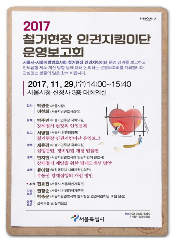 이번 보고회에서는 철거민의 인권보호를 위해 노력해온 서울시와 서울지방변호사회의 철거현장 인권지킴이단의 8개월 동안의 활동을 점검해 보는 것은 물론이고, 인도집행 제도 개선 방향 등에 대하여 국회, 법원, 행정처 및 관계 공무원 등이 참여해 논의할 예정이다.