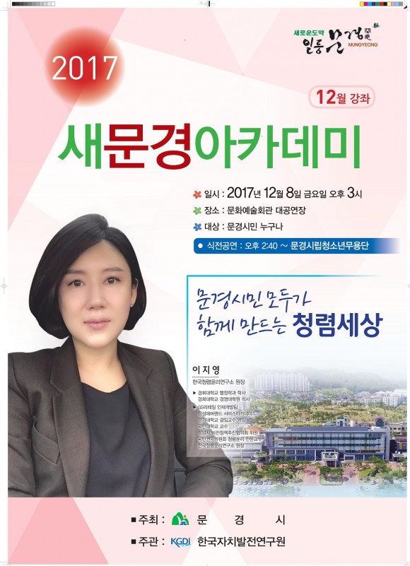 |  | | | ⓒ (주)영남도민일보 | | [영남도민일보] 김재근 기자 = 문경시(시장 고윤환)는 한국청렴윤리연구소의 이지영 원장을 초빙해 오는 12월 8일 오후 3시에 문화예술 대공연장에서 ‘문경 시민과 함께 만드는 청렴세상’이라는 주제로 새문경아카데미 12월 특강을 개최한다.
