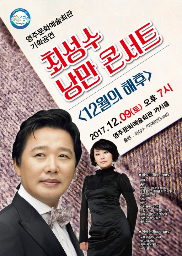 |  | | | ⓒ (주)영남도민일보 | | [영남도민일보] 김창기 기자 = 영주문화예술회관(관장 권오덕)은 오는 9일 오후 7시 영주문화예술회관 까치홀에서 기획공연 ‘최성수 낭만콘서트’가 열린다고 6일 밝혔다.
