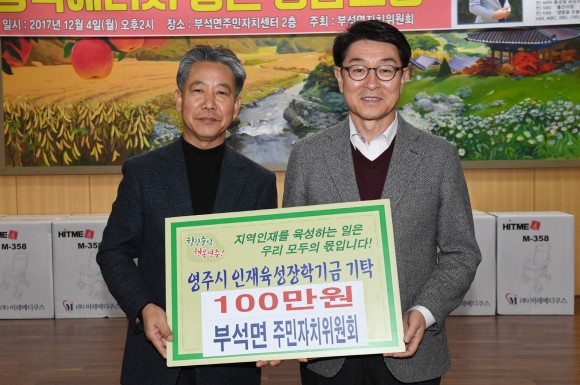|  | | | ⓒ (주)영남도민일보 | | [영남도민일보] 김창기 기자 = 영주시인재육성장학회는 지난 4일 부석면 주민자치위원회(주민자치위원장 김무영)에서 100만원을 기탁했다고 7일 밝혔다.