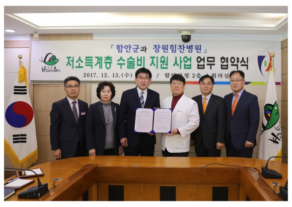 |  | | | ⓒ (주)영남도민일보 | | [영남도민일보]영남도민일보 기자 = 함안군은 지난 13일 군청 2층 소회의실에서 창원힘찬병원(병원장 안농겸)과 관내 저소득계층을 대상으로 ‘수술비 지원’을 위한 업무 협약을 체결했다.