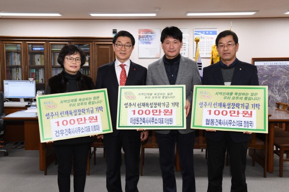 |  | | | ⓒ (주)영남도민일보 | | [영남도민일보] 김창기 기자 = 영주인재육성장학회는 이상원건축사사무소(대표 이상원), 건우건축사사무소(대표 이희대), 협동건축사사무소(대표 정창국)에서 각 100만원씩 총 300만원을, 영주시 귀농귀촌연합회(회장 이철희)에서 100만원을 장학금으로 기탁했다고 20일 밝혔다.
