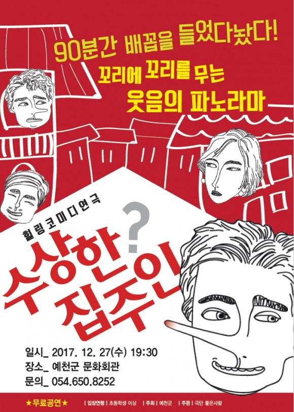 |  | | | ⓒ (주)영남도민일보 | | [영남도민일보] 김재근 기자 = 예천군은 오는 27일(수) 저녁 7시 30분 예천군 문화회관에서 리얼 코미디 연극 ‘수상한 집주인’을 공연한다. 연말을 맞이하여 기획된 이번 공연은, 영국의 천재 작가 마이클 쿠니의 작품으로 정리 해고당한 주인집 남자에게 우연히 걸려온 전화 한통을 시작으로 자신의 거짓말 대상을 한명씩 죽이면서 일어나는 해프닝을 그린 코미디 연극이다.