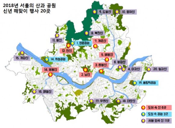시는 해맞이 행사가 열리는 일출 명소 20곳을 ▴도심 속 산 6곳(남산, 안산, 응봉산, 배봉산, 개운산, 용왕산), ▴서울 외곽을 둘러싼 산 11곳(개화산, 봉산, 북한산, 도봉산, 불암산, 봉화산, 아차산, 일자산, 대모산, 우면산, 매봉산), ▴시내 공원 3곳(청운공원, 월드컵공원, 올림픽공원)으로 구분해 소개했다.