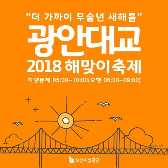 이어서, 2018 광안대교 해맞이축제는 2018년 1월 1일 오전 6시부터 오전 9시까지 3시간 동안 광안대교 상층부 전구간이 보행 개방되고, 상층부 오전 5시부터 오전 10시까지 차량 출입이 통제되며 하층부는 차량 통행이 유지된다.