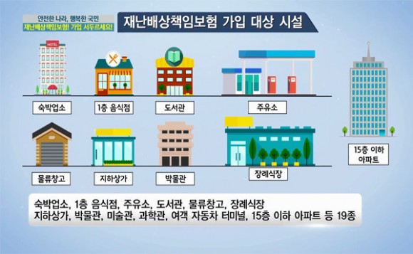 재난취약시설 의무보험은 지난해 1월 8일부터 관련법령이 시행되었고, 음식점과 숙박업소를 포함한 19종의 가입대상 시설이 계도기간 내에 해당 보험에 가입하지 않을 시, 최저 30만원에서 최고 300만원 까지 과태료를 부과하도록 되어 있다.