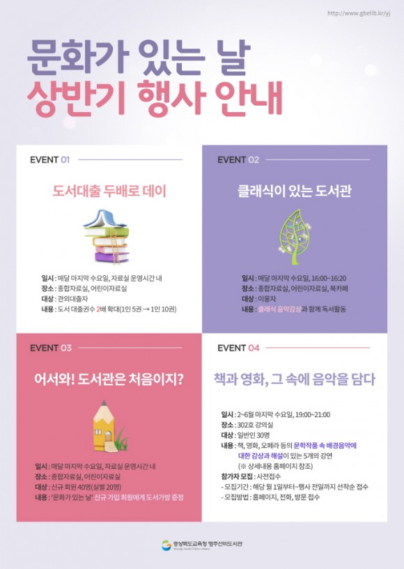 상반기「문화가 있는 날」행사로는 도서 대출권수를 5권에서 10권으로 확대하는‘두배로데이’와 수준 높은 클래식 음악 감상과 독서를 함께 즐기는 ‘클래식이 있는 도서관’, 당일 신규 가입하는 회원에게 도서가방을 증정하여‘어서와! 도서관은 처음이지?’등이 있으며 2월부터 6월까지는 책, 영화, 오페라 등의 문학작품 속 음악에 대한 해설과 감상이 있는‘책과 영화, 그 속에 음악을 담다’강연을 총 5회로 구성하여 청소년과 일반인을 대상으로 매달 1일부터 선착순으로 접수를 받아 운영한다.