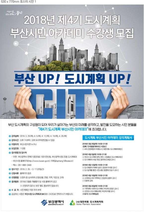 또한, 부산시에서는 시민아카데미 운영 방식을 개선하여 강의시간 연장(8시간→10시간), 프로그램 다양화(4차 산업혁명, 인문학 등)에 힘쓰고 있으며, 올해에도 상‧하반기 ‘도시계획 부산시민 아카데미’를 개최한다.