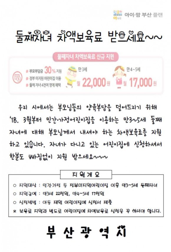 이에, 부산시는 법정저소득층과 셋째자녀 이후 자녀에 대해 지원하던 차액보육료를 둘째자녀까지 확대하여 지원하기로 하였다. 올해 3월부터 ▲만3세는 매월 2만2천원을, ▲만4~5세는 매월 1만7천원을 지원받게 되며, 약 4천여명의 둘째자녀가 차액보육료 경감혜택을 누리게 될 전망이다.