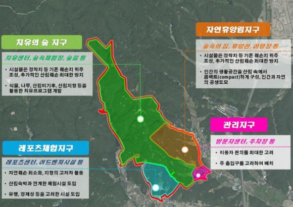 울산산림복지단지 구상(안)에 따르면 관리지구, 자연휴양지구, 치유의 숲지구, 레포츠체험지구 등 4개 지구로 구분하여 숲속의 집, 트리하우스, 치유센터, 치유숲길, 레포츠센터, 어드벤처시설 등이 들어설 예정이다.