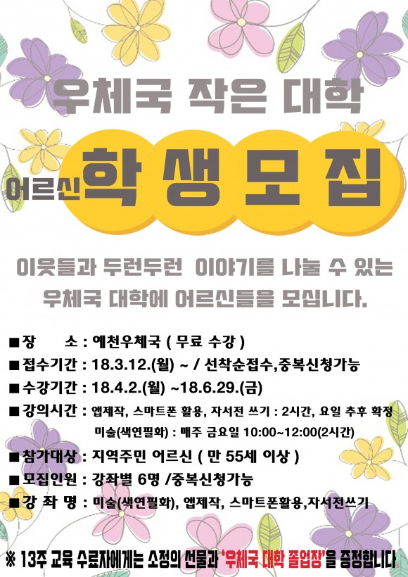 |  | | | ⓒ (주)영남도민일보 | | [영남도민일보] 김재근 기자 = 예천우체국의 여유 공간을 활용해 지역주민들에게 더 친근한 이미지로 다가가고 앞서가는 정보화 교육을 실현하고자 “우체국 작은 대학”수강생 모집을 한다.
