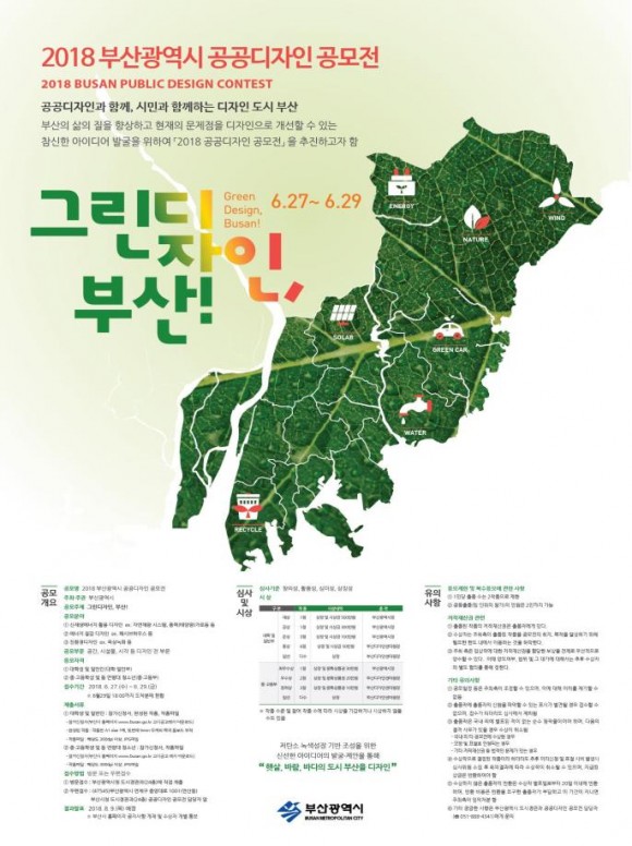 특히, 올해는 저탄소 녹색성장 기반 조성을 위하여 ‘그린디자인, 부산!’이라는 주제로 신재생에너지 활용 디자인, 에너지 절감디자인, 친환경디자인 세 가지 분야의 공간, 시설물, 시각 등 디자인 전 부문을 대상으로 공공디자인을 공모한다.