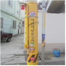 노란전신주는 노란표지판으로 전신주를 포장하여 운전자에게 어린이보호구역을 주행하고 있음을 알려주는 효과가 있다.