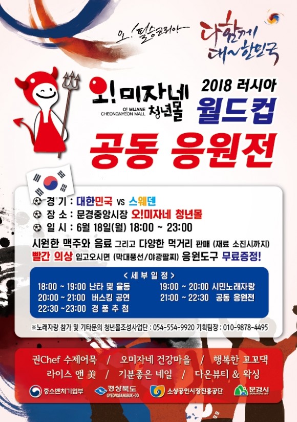 |  | | | ⓒ (주)영남도민일보 | | [영남도민일보] 김재근 기자 = 2018년 러시아 월드컵 전통시장 장터 응원전이 「오!미자네 청년몰」에서 6월 18일 18시부터 개최된다.