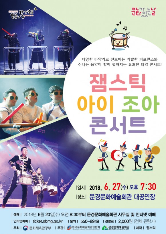 |  | | | ⓒ (주)영남도민일보 | | [영남도민일보] 김재근 기자 = 6월 문화가 있는 날(매월 마지막 주 수요일)을 맞이하여 “잼스틱 아이 조아”콘서트가 27일(수) 저녁7시 30분 문경문화예술회관 대공연장에서 열린다.