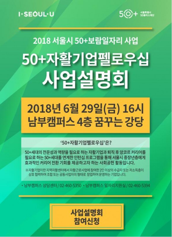 이번 사업설명회는 29일(금) 서울시50플러스 남부캠퍼스(구로구 오류동 소재)에서 진행될 예정으로, 50+자활기업펠로우십에 관심이 있는 50+세대는 누구나 참석할 수 있다.