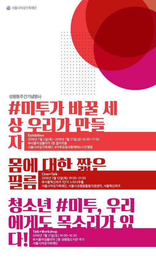 7월 21일(토) 14;00~16:30, 서울여성플라자 2층 성평등도서관 ‘여기’에서는 ‘청소년 #미투, 우리에게도 목소리가 있다!’를 주제로 청소년들이 일상에서 마주하는 성평등 이슈에 대해 논의해보는 강연 및 워크숍이 열린다. 7월 12일(목) 19:00~21:00, 서울혁신파크 1단지 연결동 느티나무홀에서는 ‘몸에 대한 짧은 필름’을 주제로 여성의 몸에 대해 다양한 시선을 담은 4편의 단편 영화 상영 및 이야기 나눔이 진행된다. 이밖에 서울여성플라자 1층에서는 7월 27일(금)까지 2018년 상반기 ‘#미투운동과 함께하는 시민행동’의 활동기록들을 담은 ‘#미투가 바꿀 세상 우리가 만들자’ 전시가 열린다. 강경희 서울시여성가족재단 대표이사는 “성평등한 도시가 되기 위해서는 우리 사회에 깊게 자리 잡은 성차별·성폭력이 사라져야 한다. 이를 지원하기 위해 서울시여성가족재단에서 생활 속 성평등 이슈를 주제로 강연, 상영, 전시 등을 준비했으니 관심 있는 분들의 많은 참여를 기대한다.”라고 밝혔다.