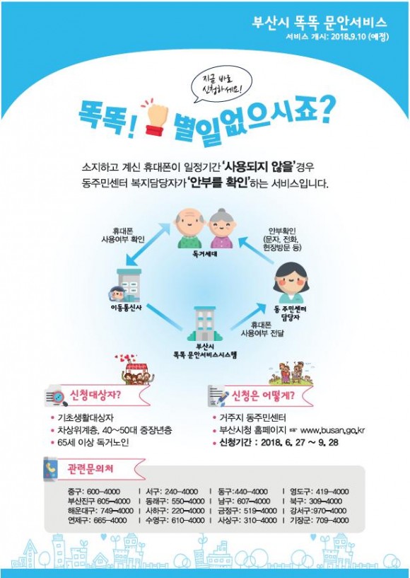 |  | | | ⓒ (주)영남도민일보 | | [영남도민일보] 최교열 기자 = 부산시(시장 오거돈)는 9월 10일부터 휴대전화 수․발신 이력데이터 분석으로 안부 확인을 제공하는 ‘똑똑 문안 서비스’를 시작한다고 밝혔다.