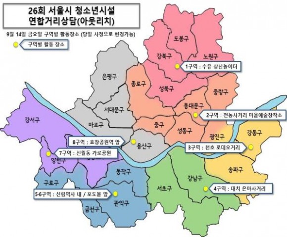 서울시는 ‘뜨거웠던 여름을 지나 더 뜨거워질 우리의 2학기’를 주제로 올해 3번째 ‘찾아가는 거리상담 연합아웃리치’를 실시한다고 밝혔다. 45개 기관의 전문상담사, 자원봉사자 등 240여 명이 함께 한다. ○ ‘찾아가는 거리상담 연합아웃리치’는 '12년 서울시가 전국 최초로 실시한 청소년 대상 거리 상담활동이다. 위기 청소년이 많이 모이는 곳에 직접 찾아가 면대면 개별상담을 진행하고 상담 후엔 쉼터 연계나 귀가지원 등의 서비스를 연계한다. 청소년이 필요로 하는 서비스를 현장에서 즉시 제공함으로써 청소년시설에 대한 체감거리를 줄이는데 큰 역할을 하고 있다. 매년 4회 진행된다. 이번 상담엔 청소년쉼터, 청소년상담복지센터, 청소년성문화센터, 학교밖청소년지원센터 등 45개 청소년시설과 전문상담사, 자원봉사자 등 240여명, SPO(학교전담경찰관) 및 각 경찰서 여성청소년계가 참여한다. 다년간 축적된 경험을 바탕으로 청소년의 욕구를 반영한 맞춤형 프로그램 운영 및 상담을 진행할 예정이다.