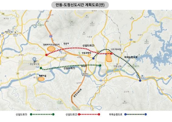 하나는 옥동쪽에서 풍산읍 막곡리를 거쳐 회곡리-수리-하리-풍천면 병산리-신도청으로 가는 길이다. 이 길은 안동 옥동과 도청신도시 간 교통을 원활히 하고, 길안·임동면을 외관순환도로와 연결하고 안동시 남부지역을 도청신도시와 소통하는 중요한 길이다. 현재 자동차전용도로가 교통량의 한계에 와 있으므로 일차적으로 시급한 도로이다.
