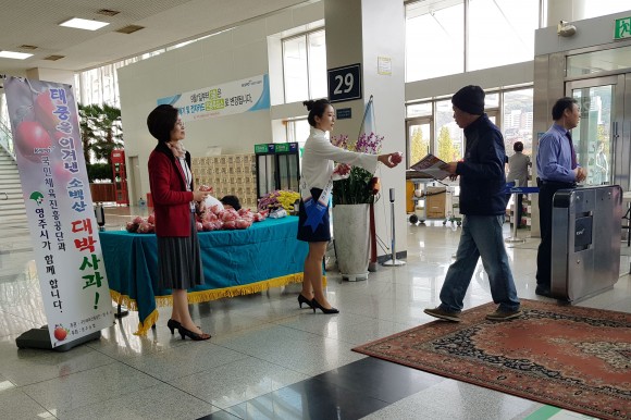 31일 시에 따르면 제 25호 태풍 콩레이 피해 농가의 사과판매 어려움을 해소하고 농가와 소비자 간의 상생을 도모하기 위한 태풍 피해사과 팔아주기 행사를 지난 29일(월)부터 시작했다.