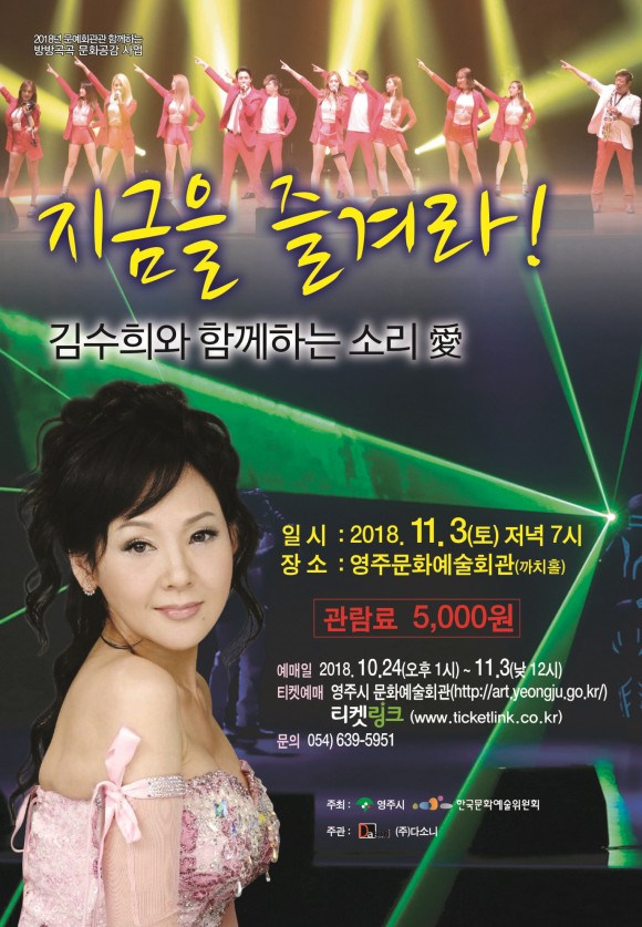 |  | | | ⓒ (주)영남도민일보 | | [영남도민일보] 김창기 기자 = 영주시는 오는 11월 3일 토요일 오후7시 영주문화예술회관 까치홀에서 ‘김수희와 함께하는 소리愛 지금을 즐겨라’ 공연을 개최한다.