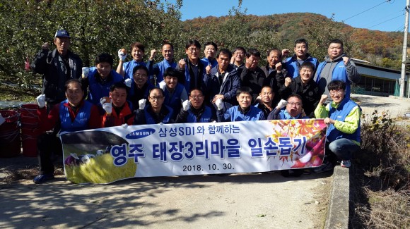 |  | | | ⓒ (주)영남도민일보 | | [영남도민일보] 김창기 기자 = 지난 30일 영주시 순흥면 태장3리 안준덕 농가가 경영하는 태장리 698번지 일원 과수원에서 삼성SDI 울산사업장(인솔자 김정성) 직원 20여명이 자매결연 마을 농촌 일손돕기 일환으로 직접 사과를 수확하고, 손수 수확한 사과 50여 상자를 구매하는 자매결연 행사를 가졌다.