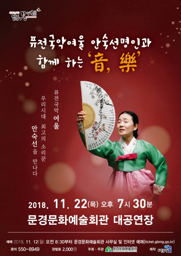 |  | | | ⓒ (주)영남도민일보 | | [영남도민일보] 김재근 기자 = 문경문화예술회관 대공연장에서 오는 11월 22일 오후 7시 30분 퓨전국악 여울이 안숙선 명인과 함께 하는 ‘音, 樂 ’기획공연이 열린다.