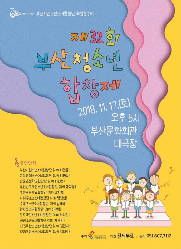 제32회 부산청소년합창제는 매년 개최되는 부산시립소년소녀합창단의 특별연주회로 만5세 이상의 관객이라면 입장권 없이 무료로 감상할 수 있다.